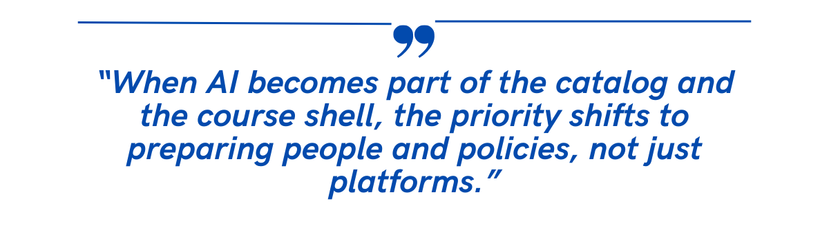 Embedding AI tools within the LMS reduces barriers for course design, feedback, and accessibility. Centralized access supports professional development at scale and fosters consistent disclosure practices in coursework and research.