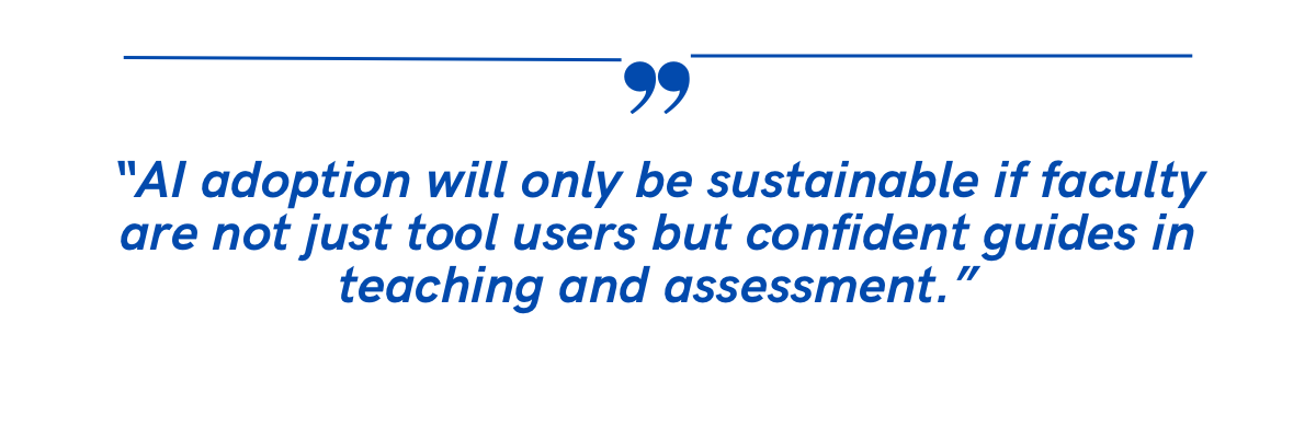 Faculty are pivotal to sustainable AI adoption. Structured literacy programs can shift practice, not just awareness—embedding ethics,