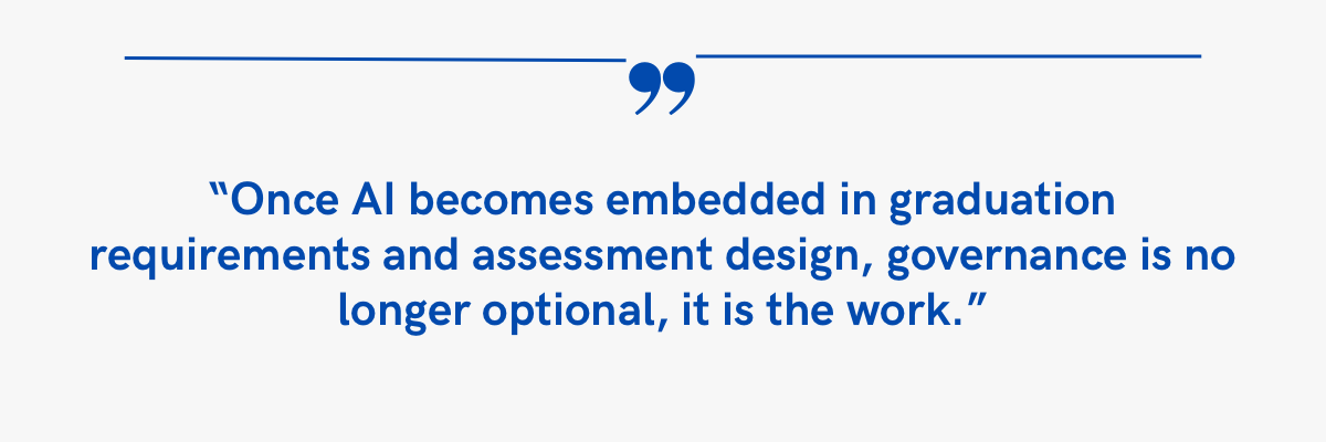 This decision shifts AI from optional exposure to an academic requirement. Faculty are now responsible for defining what competent, ethical AI use looks like within their disciplines. Institutions that do not clarify governance authority, workload expectations, and assessment ownership risk uneven execution and faculty pushback.